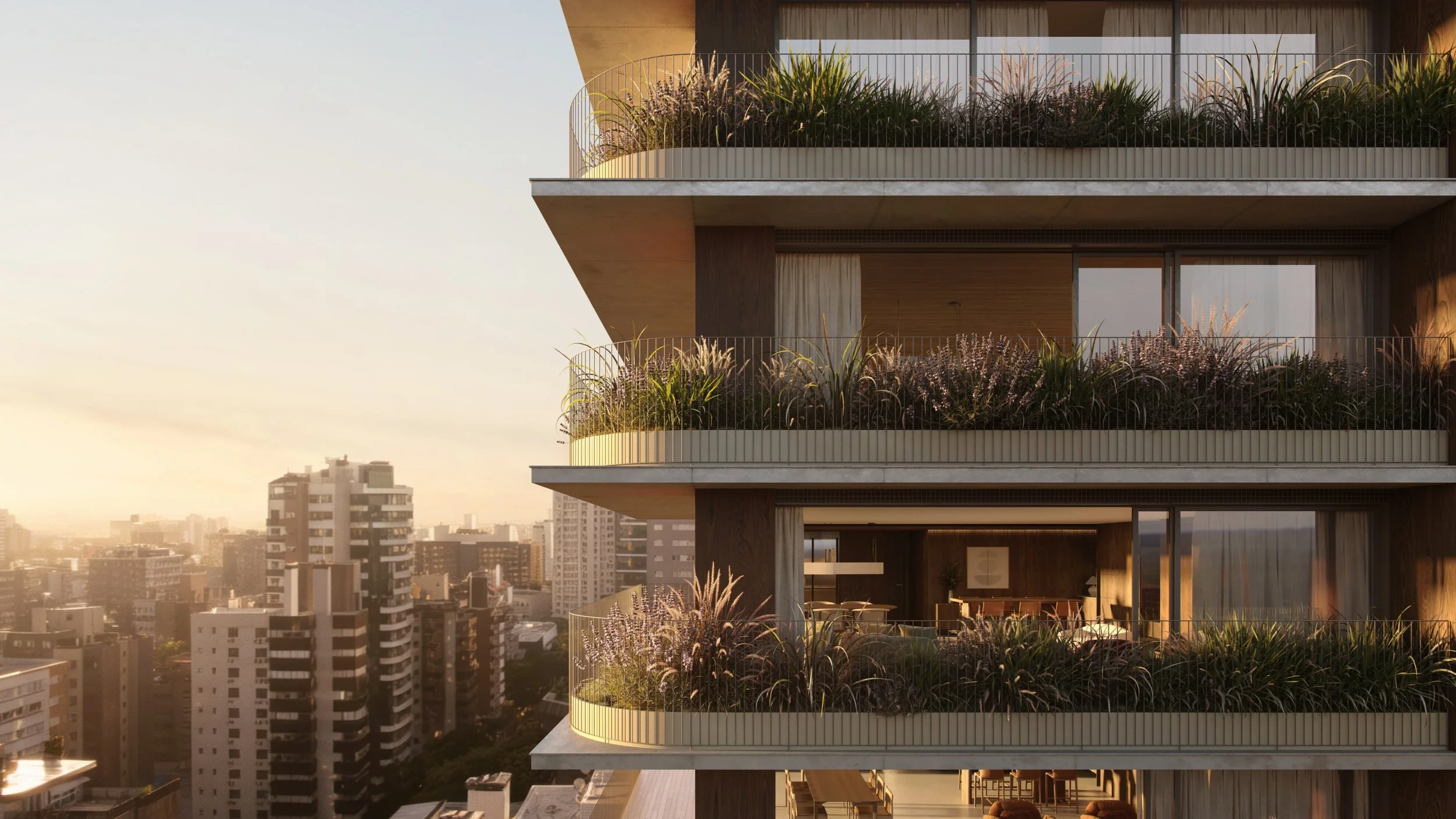 Em conjunto com a Knijnik, nosso desejo foi que o empreendimento nascesse como uma experiência: um edifício que começa na vista e se revela nos detalhes. Ambientes que se abrem para sacadas e floreiras, diluindo os limites entre interior e exterior e transformando os apartamentos em varandas suspensas sobre a paisagem. Curvas suaves, materialidade acolhedora e uma narrativa sensorial que se percorre, se sente e se vive.